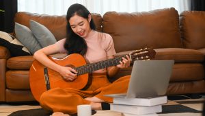 基礎的なコードストロークやアルペジオ、弾き語りなど幅広くレクチャーしています。ギターを使って、オリジナルソングを作ったり、好きな曲を弾き語りできるようになります♪